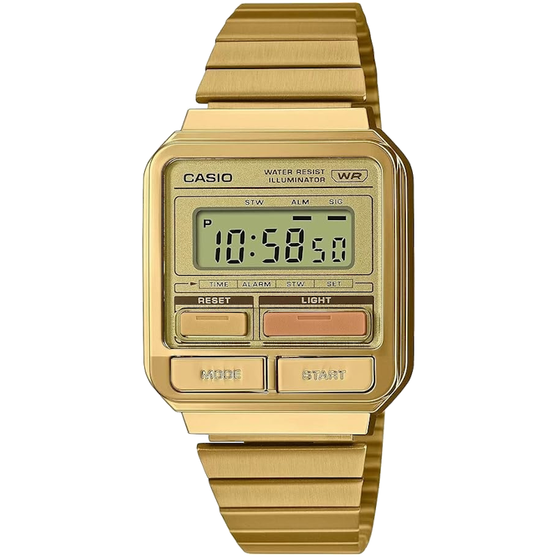 Casio A120WEG-9AEF er et retro digitalur med guldfarvet finish og farverige front-knapper, som giver et legende twist til det klassiske Casio Vintage-udseende. Uret har en stållænke og digital skærm, der viser både tid, dato og ugedag.