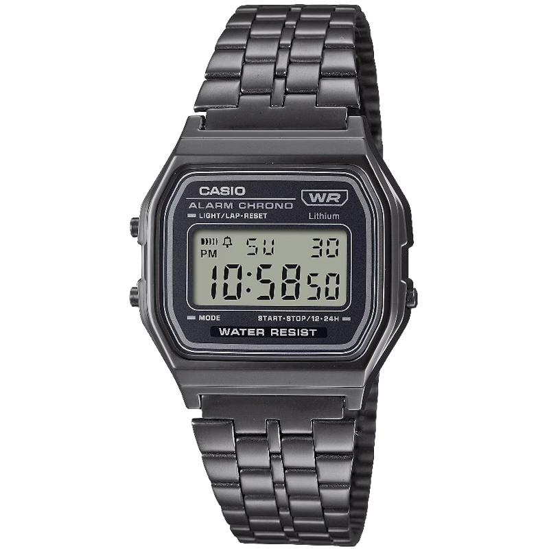 Casio A158WETB-1AEF er en moderne fortolkning af den klassiske A158-serie, men opdateret med en mat sort stållænke og en mørkere, mere afdæmpet finish. Det giver modellen et stilrent og minimalistisk udtryk, samtidig med at den bevarer alle de velkendte retrodetaljer fra Casios digitale ure fra 1980’erne. Den ikoniske rektangulære skærm, de tydelige knapper og den lette konstruktion gør uret både komfortabelt og tidløst i udtrykket.