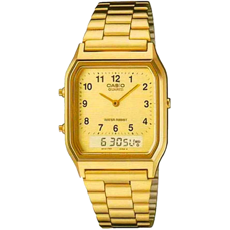 Casio AQ-230GA-9BMQ kombinerer klassisk analogt design med digital funktionalitet i et elegant, guldfarvet ur. Den dobbelte visning gør det muligt både at aflæse tiden på viserne og på det lille digitale display, der giver adgang til funktioner som alarm, stopur og dobbelt tidszone. Med sit slanke retrodesign og guldtonede stållænke henter modellen tydelig inspiration fra Casios 1980’er-ure — men med moderne teknologi og høj præcision.