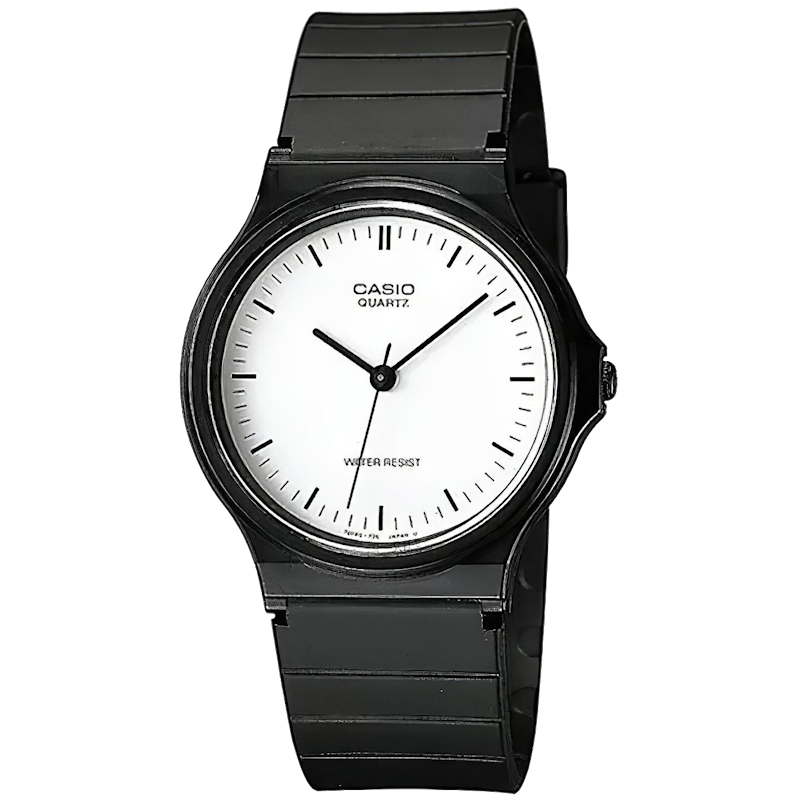 Casio MQ-24-7ELDF er et lille, enkelt analogur med sort resin-kasse og sort resinrem. Skiven er hvid og meget ren i udtrykket: ingen tal, kun smalle time-markeringer hele vejen rundt. De sorte visere står tydeligt mod den lyse skive, og der er ingen dato eller ekstra felter – kun tid med time, minut og sekund. Uret er let på håndleddet.
